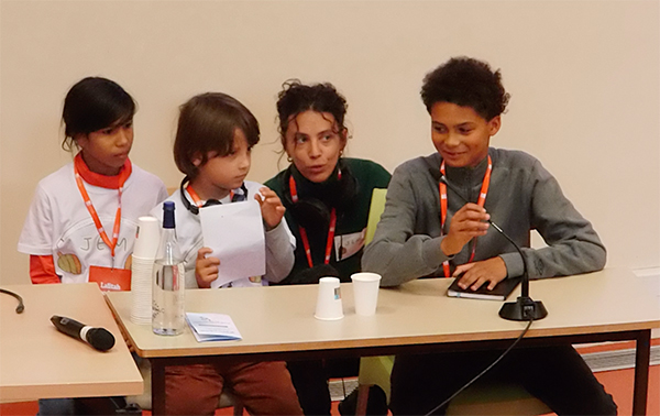 Pendant tout le colloque, un petit groupe d’enfants a réalisé des interviews en vue d’un prochain podcast, où ils comptent se demander : qu’est-ce que la misopédie ? Accompagnés par Nina, qui se contente de faciliter l’organisation sans orienter leur regard, ils témoignent d’une expérience journalistique originale : ce sont les enfants qui choisissent les sujets, posent les questions, débattent, s’interrompent et décident de ce qu’ils veulent partager. L’adulte n’est là que pour soutenir techniquement et dit elle-même devoir lutter contre sa propre censure – tant les enfants savent ce qu’ils veulent dire. Ils racontent leurs épisodes précédents – Qu’est-ce qu’un journal ?, L’univers est-il infini ?, Pourquoi les humains polluent ? – et expliquent qu’ils préfèrent enregistrer « dans les bois » où ils se sentent bien. Ils revendiquent aussi le droit de ne pas choisir des thèmes pour que les adultes soient contents. Quand on leur demande leur idéal, l’un répond spontanément : « Un podcast sans adultes ! » Ce moment simple et vivant donne à voir des enfants qui prennent leur place, qui interrogent la misopédie avec leurs mots, et qui construisent un média à leur image.